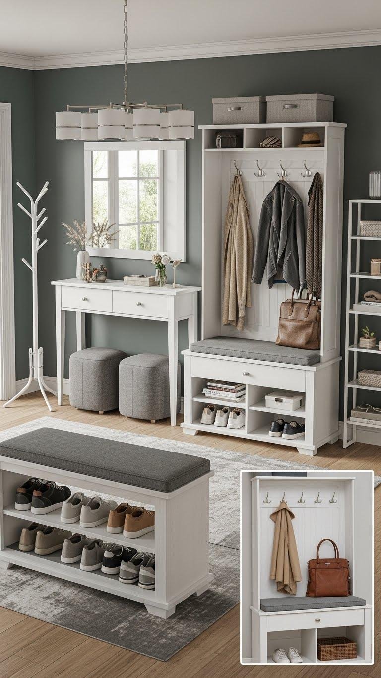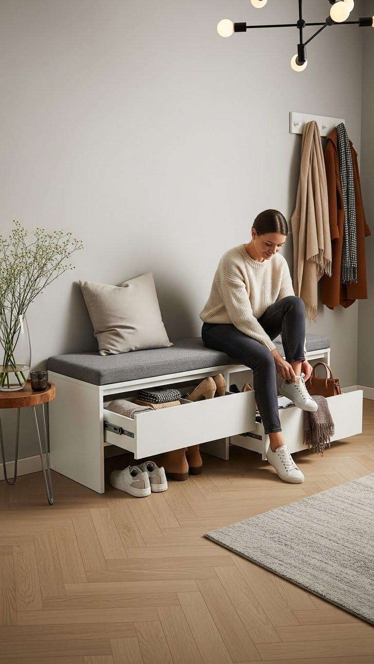 Once you’ve set up a drop zone, add a bench with built‑in storage to keep shoes, bags, and seasonal extras out of sight while giving you a seat to put them on.