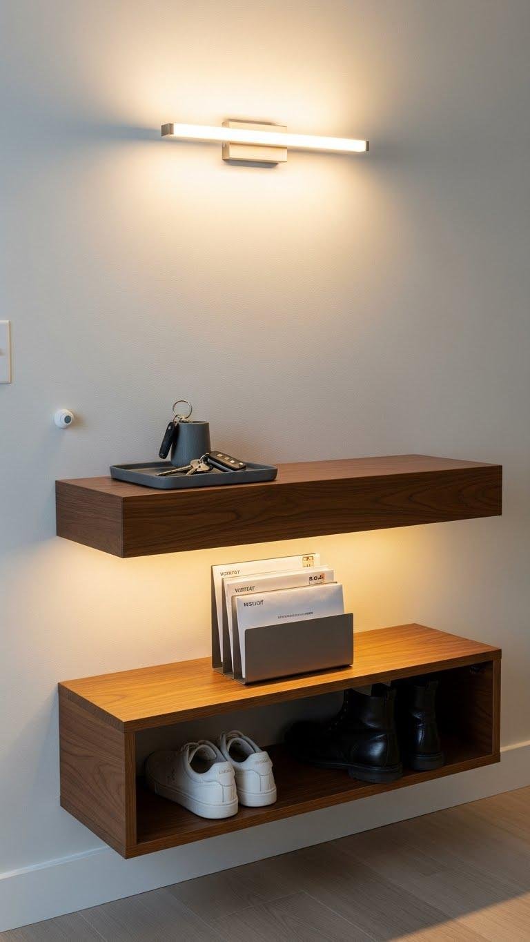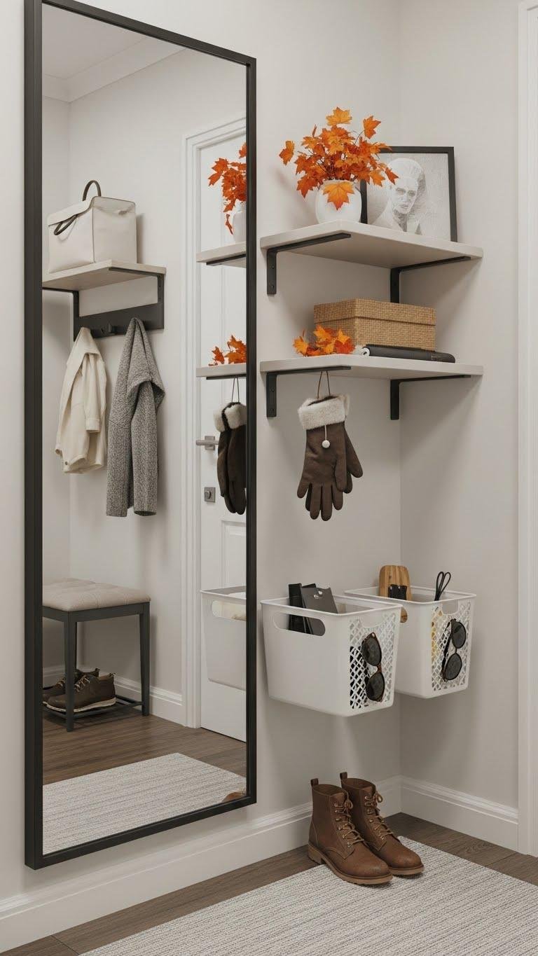 Mirrors open up sightlines; floating shelves keep the floor clear while giving you targeted storage for seasonal essentials. Mount narrow shelves at eye level, rotate seasonal decor without clutter, and stash gloves or sunglasses in floating baskets for quick grabs.