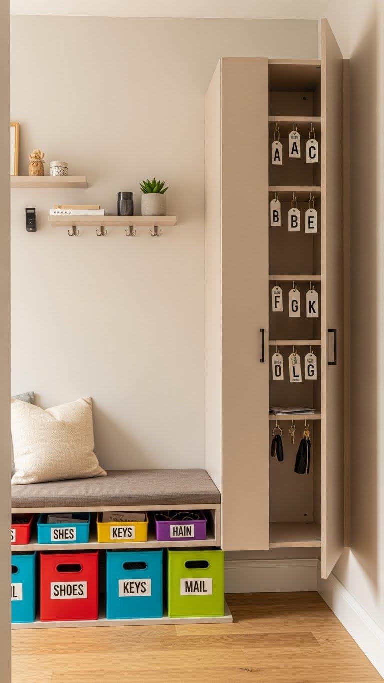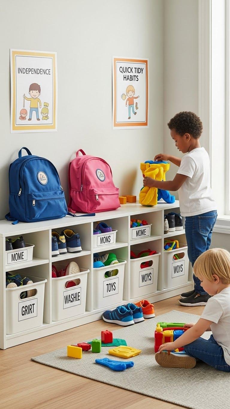 Because little hands need easy access, lower the storage so kids can grab shoes, backpacks, and toys without help. You’ll install a low shelf at reachable height, pair it with labeled washable bins, and leave open slots for spontaneous play.