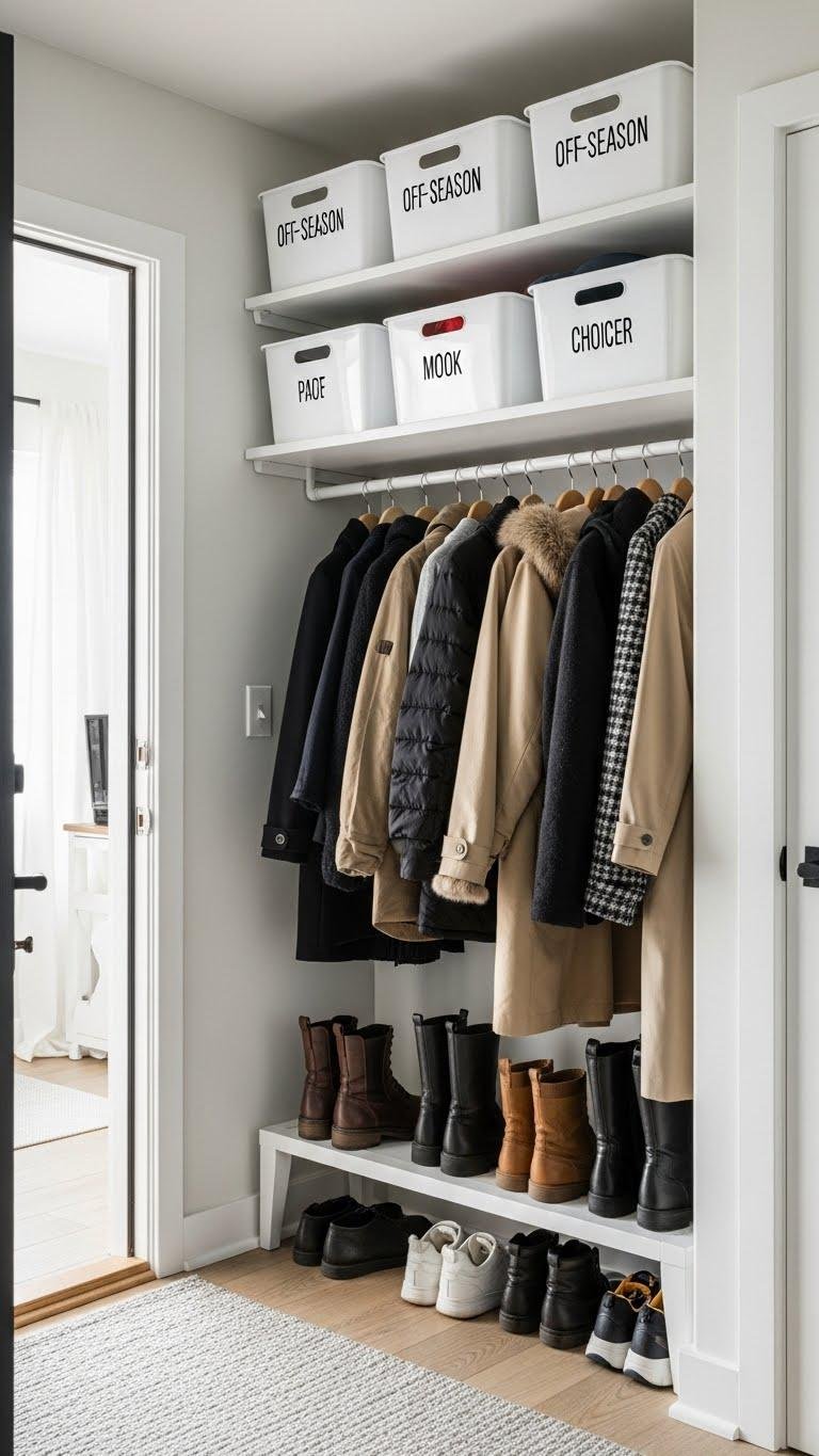 Plan a simple seasonal rotation: store off-season boots and coats in labeled bins or a high shelf, then do a quick closet swap each changeover. You’ll free space, cut morning friction, and keep choices intentional so you can move through your day without extra weight.