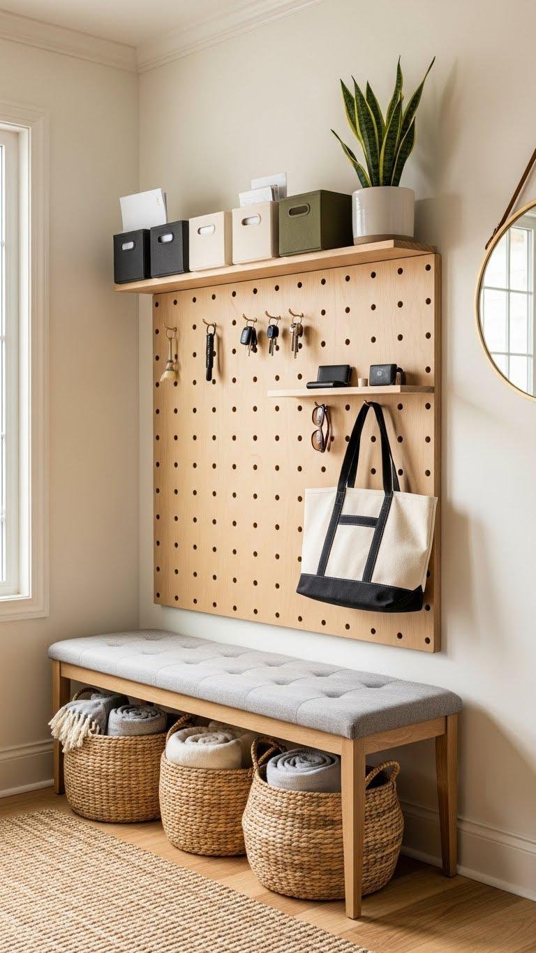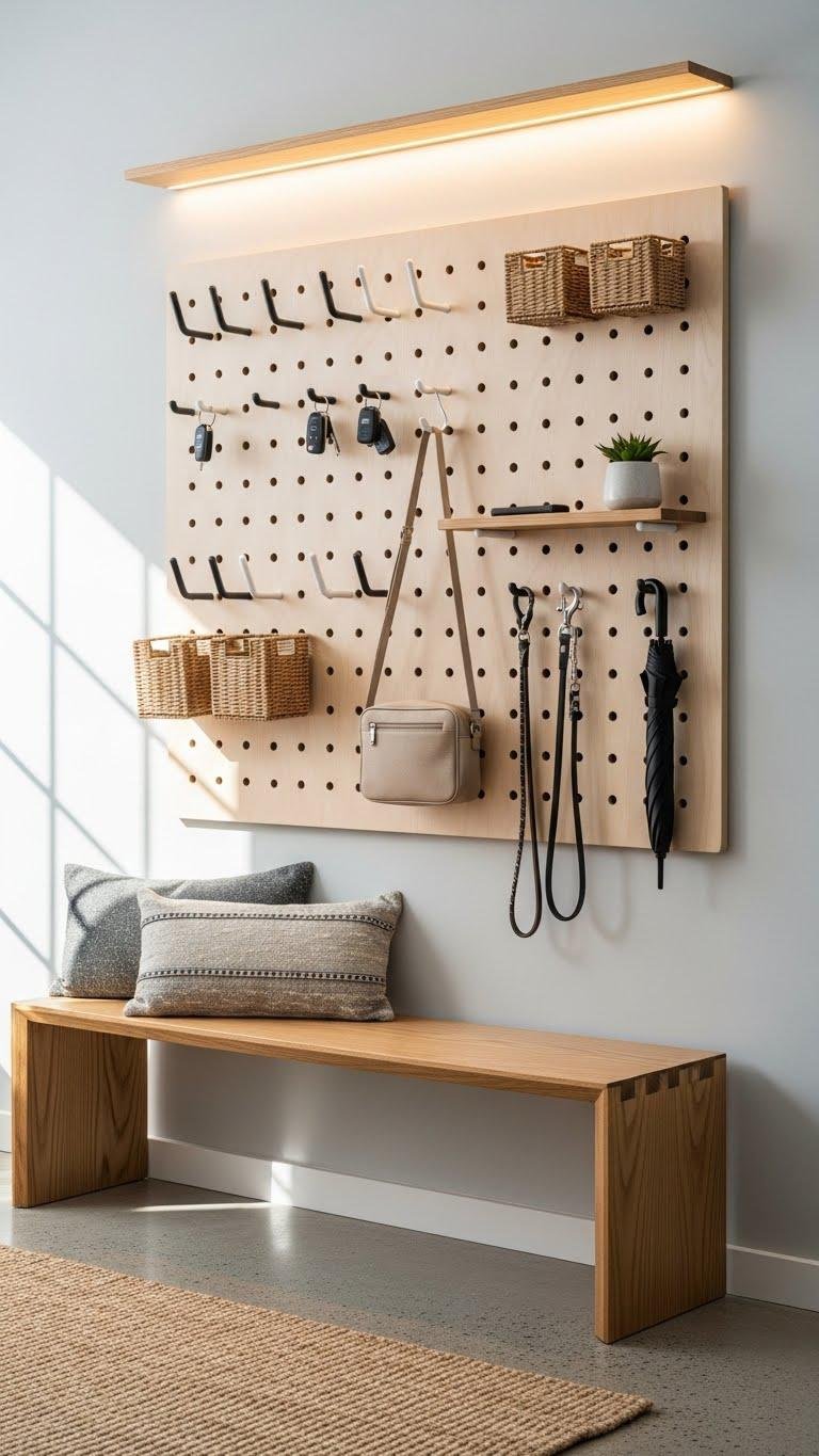 Add a pegboard and you’ll instantly reclaim wall space for whatever your entryway needs: keys, bags, dog leashes, umbrellas, even a small shelf for mail. You’ll configure a vertical grid for quick-access Tool storage and accessories, swapping hooks or baskets as life changes.