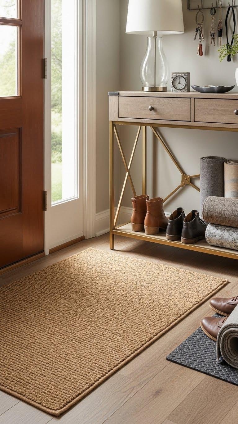 Think of a small rug as the anchor that pulls your entryway together: place it directly in front of the door or beneath the console to define a clear landing zone for feet, keys, and shoes.