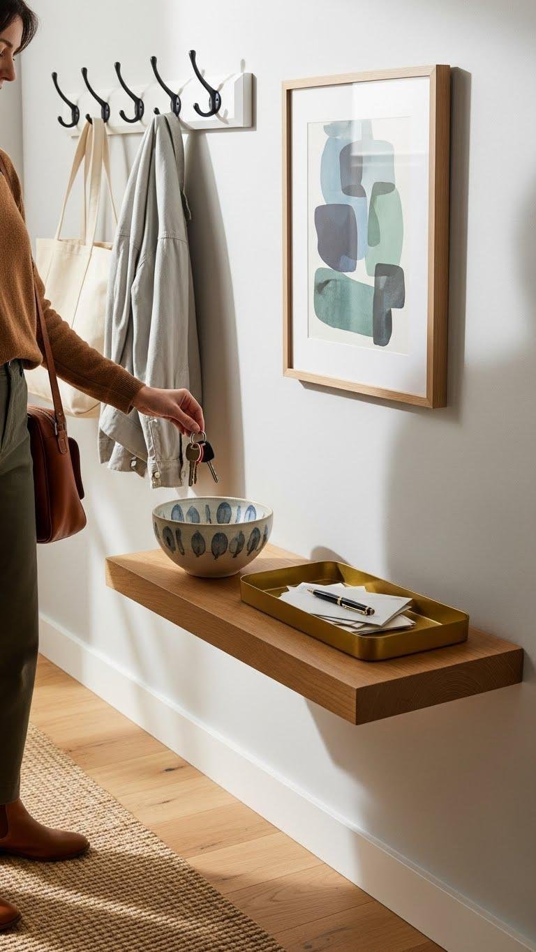 Often you’ll drop things in the entryway—keys, mail, bags, but a one-touch drop policy keeps that clutter from spreading: designate a single spot (a bowl, hook, tray, or shelf) where each item lands the moment you walk in, then deal with it later in one focused pass.