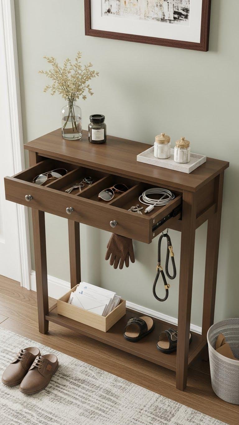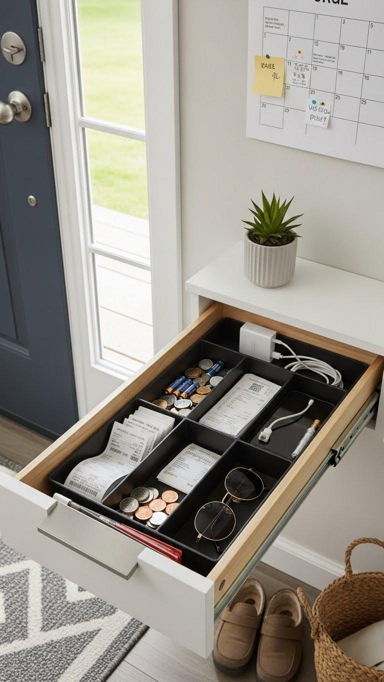 Tuck a slim catch-all drawer near the door so everyday loose ends — receipts, spare change, batteries, sunglasses — have a tidy landing spot instead of piling up.