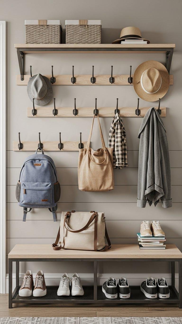 Often overlooked, wall-mounted hooks at multiple heights give your entryway instant order and function—low hooks for kids’ backpacks and shoes, mid-level for everyday coats and bags, and high hooks for hats and seasonal gear.