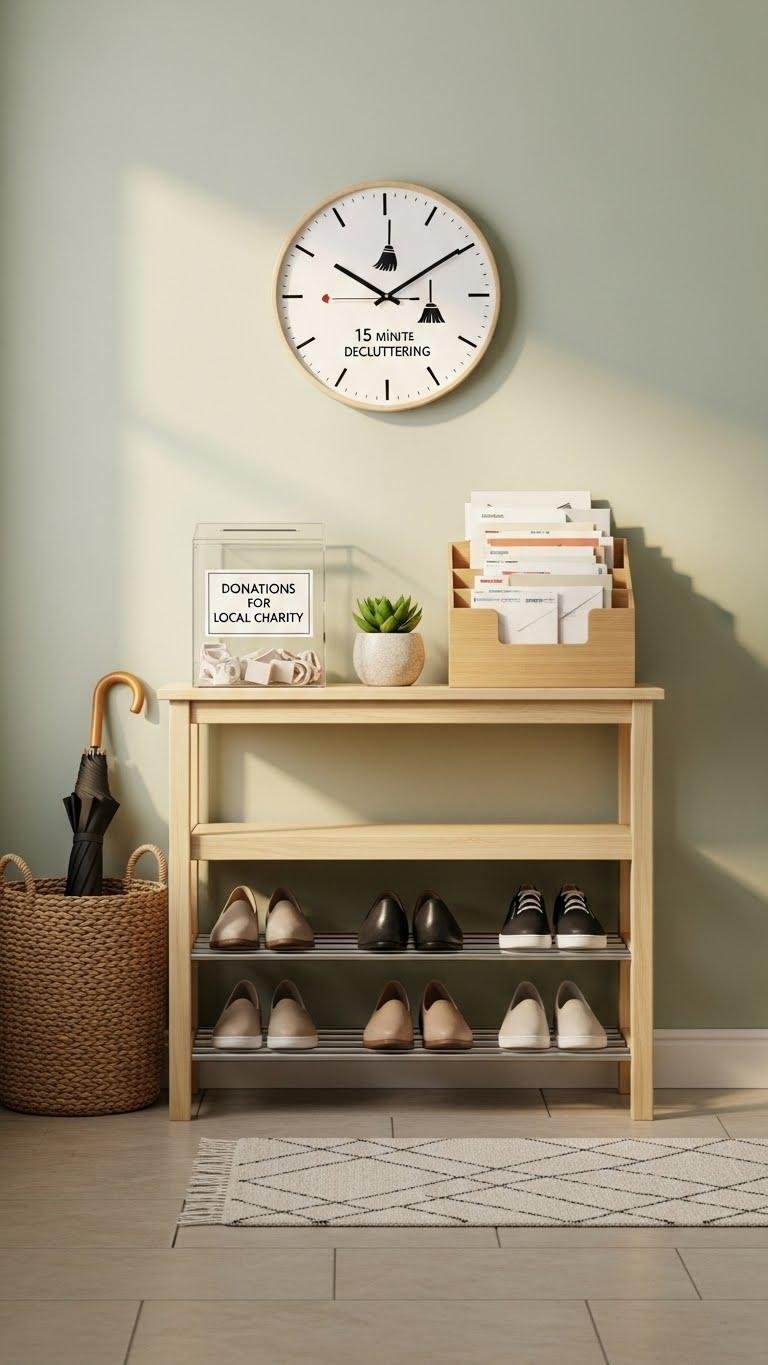 Regularly set aside short, scheduled decluttering sessions so your entryway stays functional instead of becoming a drop zone. You’ll calendar a biweekly purge—15 minutes to sort shoes, mail, and stray items.