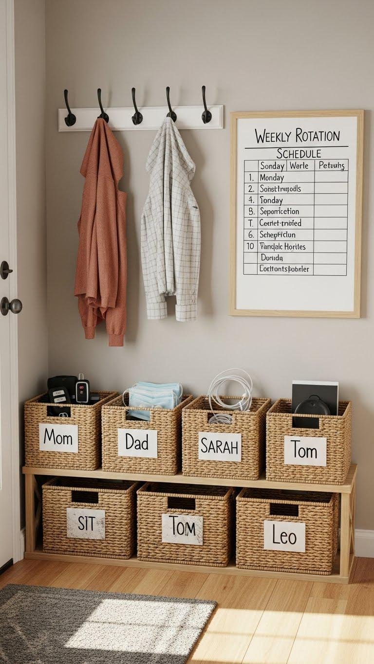 You’ll assign a basket per person, add simple tags for label maintenance, and teach everyone to drop keys, masks, or chargers inside.