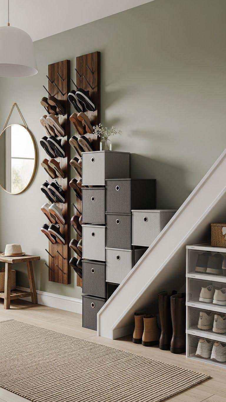 Once your mail and keys have a dedicated home, free up floor space by thinking upward with vertical shoe storage. You’ll install slim vertical racks or stackable cubbies to keep pairs accessible yet out of sight, turning walls or narrow corners into tidy zones.
