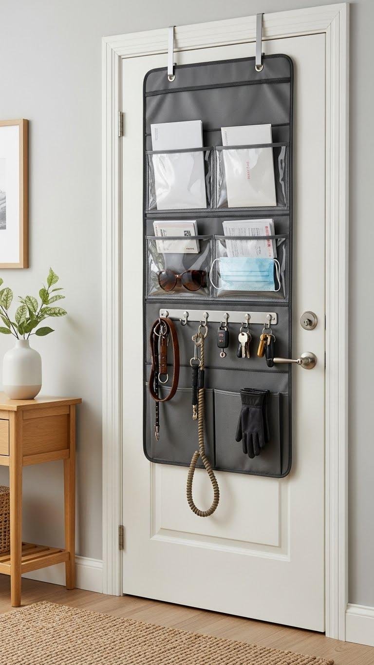 Maximize hidden storage by hanging an over-the-door organizer that keeps small essentials—mail, sunglasses, dog leashes, masks, and gloves—within reach without cluttering surfaces.