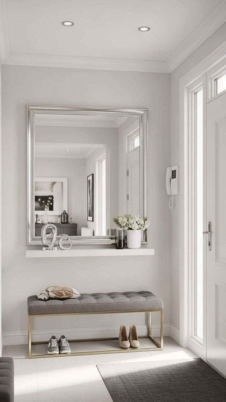 Hang a mirror to instantly open up a tight entryway — it bounces light, doubles sightlines, and makes the whole space read larger without taking up floor real estate.
