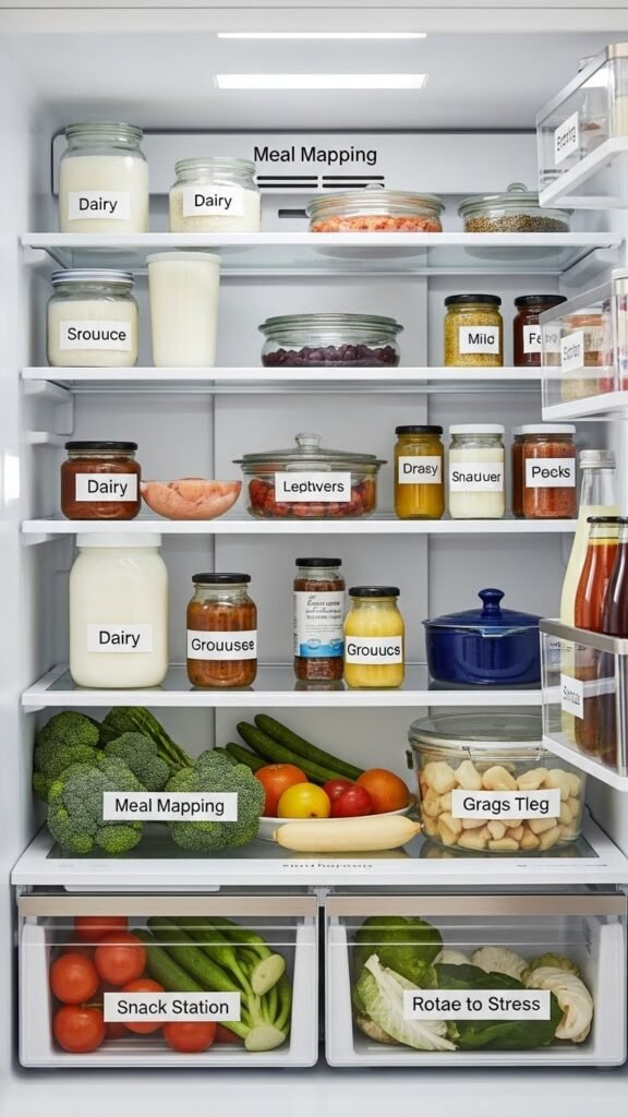 Because different foods need different conditions to stay fresh, designate clear zones in your fridge to cut spoilage and make meal prep faster. Use Meal Mapping: group dairy, produce, condiments, and leftovers in consistent spots. Create a Snack Station at eye level for grab-and-go items.