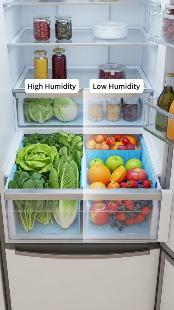 You’ll use simple humidity calibration—high for leafy greens, low for fruits—to slow spoilage.