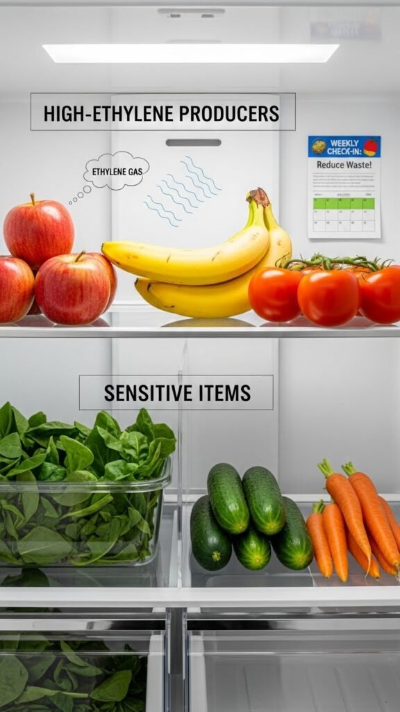 Because many fruits release ethylene gas as they ripen, you should separate high-ethylene producers (like apples, bananas, and tomatoes) from sensitive items (like leafy greens, cucumbers, and carrots) to slow spoilage and keep produce fresher longer.