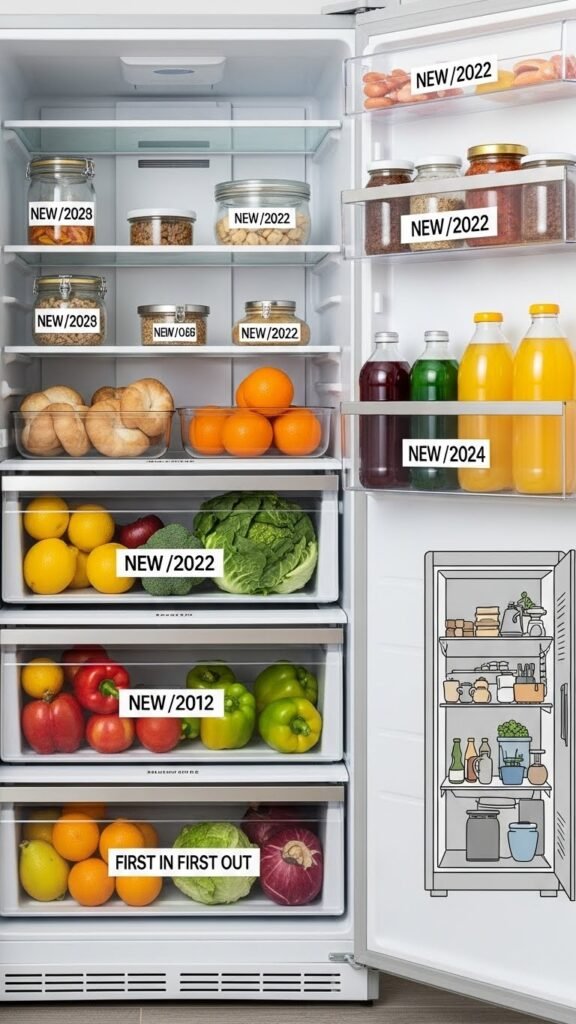 Adopt a first in first out habit: label dates, move newly bought to the back, and mirror pantry rotation principles.