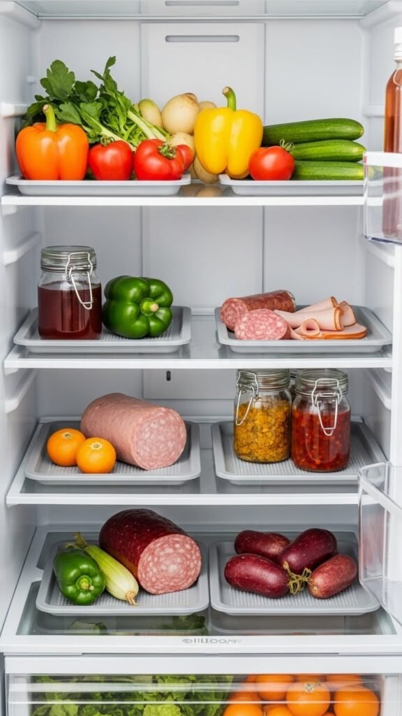 Slide in shallow trays under produce, deli meats, and jars to catch drips and keep spills contained — studies show containment strategies cut cleaning time and reduce cross-contamination risks.