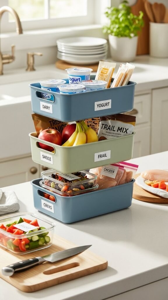Group like items together so you can see what you have at a glance and avoid buying duplicates. Use stackable baskets and simple color coding to corral dairy, snacks, and meal prep ingredients.