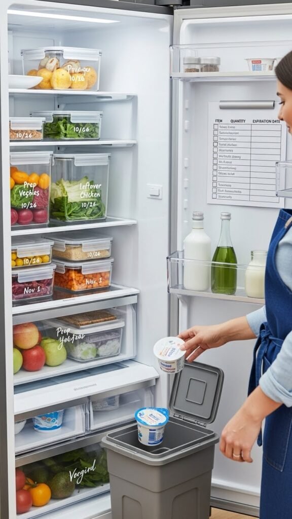Once you can see what’s in your fridge, add labels and dates so nothing gets forgotten. You’ll reduce waste and stress by using simple expiration tracking—note prep and open dates.