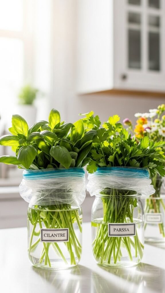 Treat herbs like little bouquets: trim the stems, place them in a jar of water, cover loosely with a plastic bag, and store them in the fridge to keep leaves crisp and aromatic for days longer.