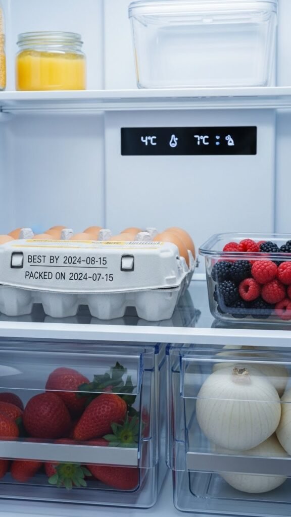 Keeping berries unwashed until serving helps control moisture—and the same attention to storage location matters for eggs. You’ll preserve egg freshness by keeping the carton on a lower, stable shelf where temperature’s consistent. Don’t use the door; its fluctuations shorten shelf life. Place the whole carton intact to protect eggs and track dates—simple carton placement boosts safety and gives you freedom from waste.
