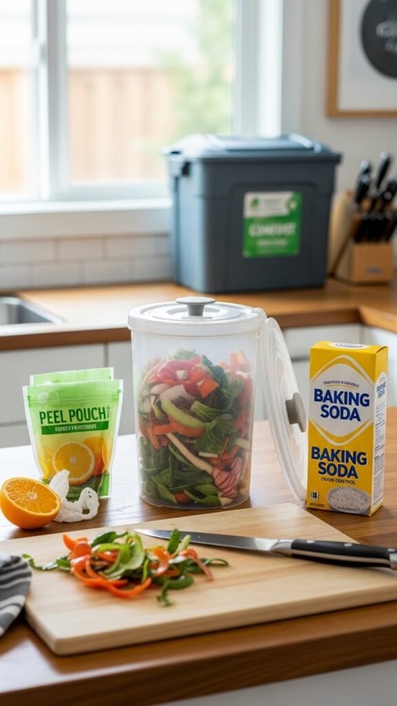 You’ll empty it by the kitchen sink or into a larger compost bin. Use peel pouches for citrus, practice odor control with baking soda, and enjoy the freedom of cleaner, efficient meal prep.