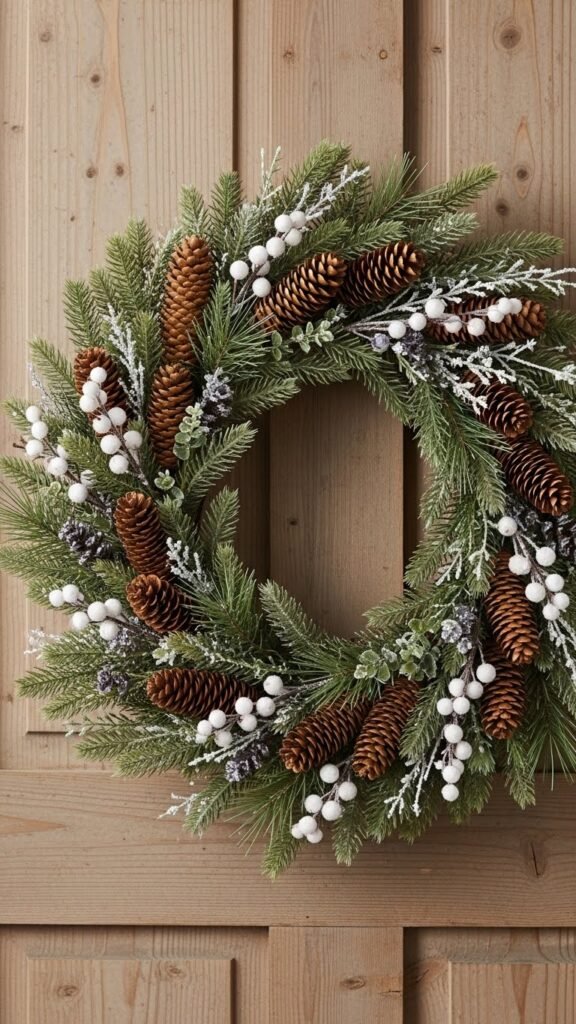 Bring four or five natural pine cones, a handful of faux berries, and a simple wreath form, and you’ll have a winter centerpiece that feels both rustic and refined.