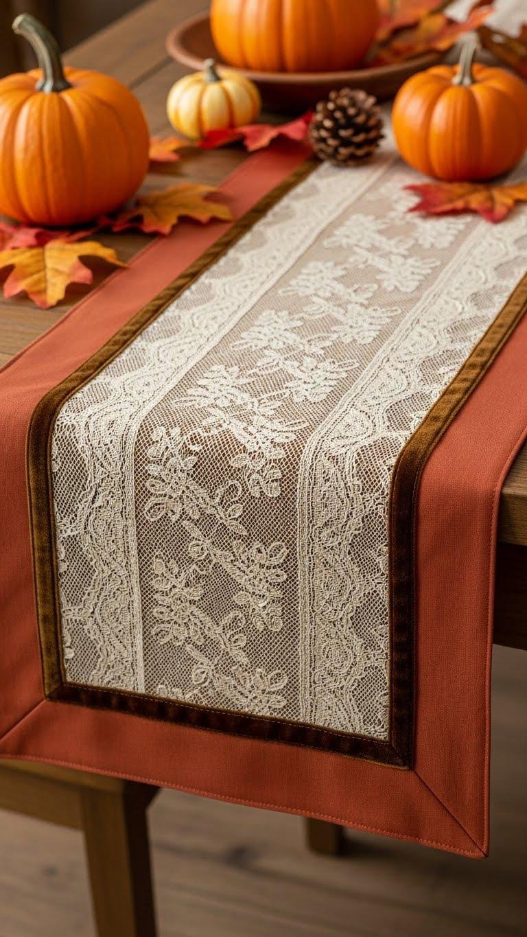 With a few yards of seasonal fabric and a strip of vintage lace, you can craft a table runner that brings warm texture and subtle elegance to your autumn table.