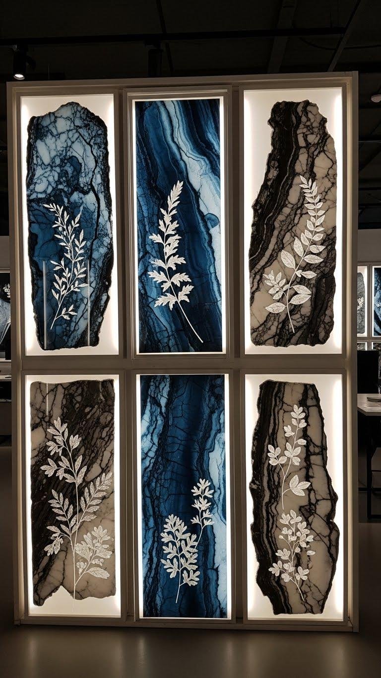 Bring bold-veined stone into the spotlight and let its dramatic lines become your room’s focal point. You’ll craft a marble inspired resin display with botanical etched detailing, mounting slices in slim frames. Use backlit panels to amplify veins and depth, creating a liberated, gallery-like statement. Keep proportions bold but simple, letting texture and light do the talking for a fearless, elegant accent.