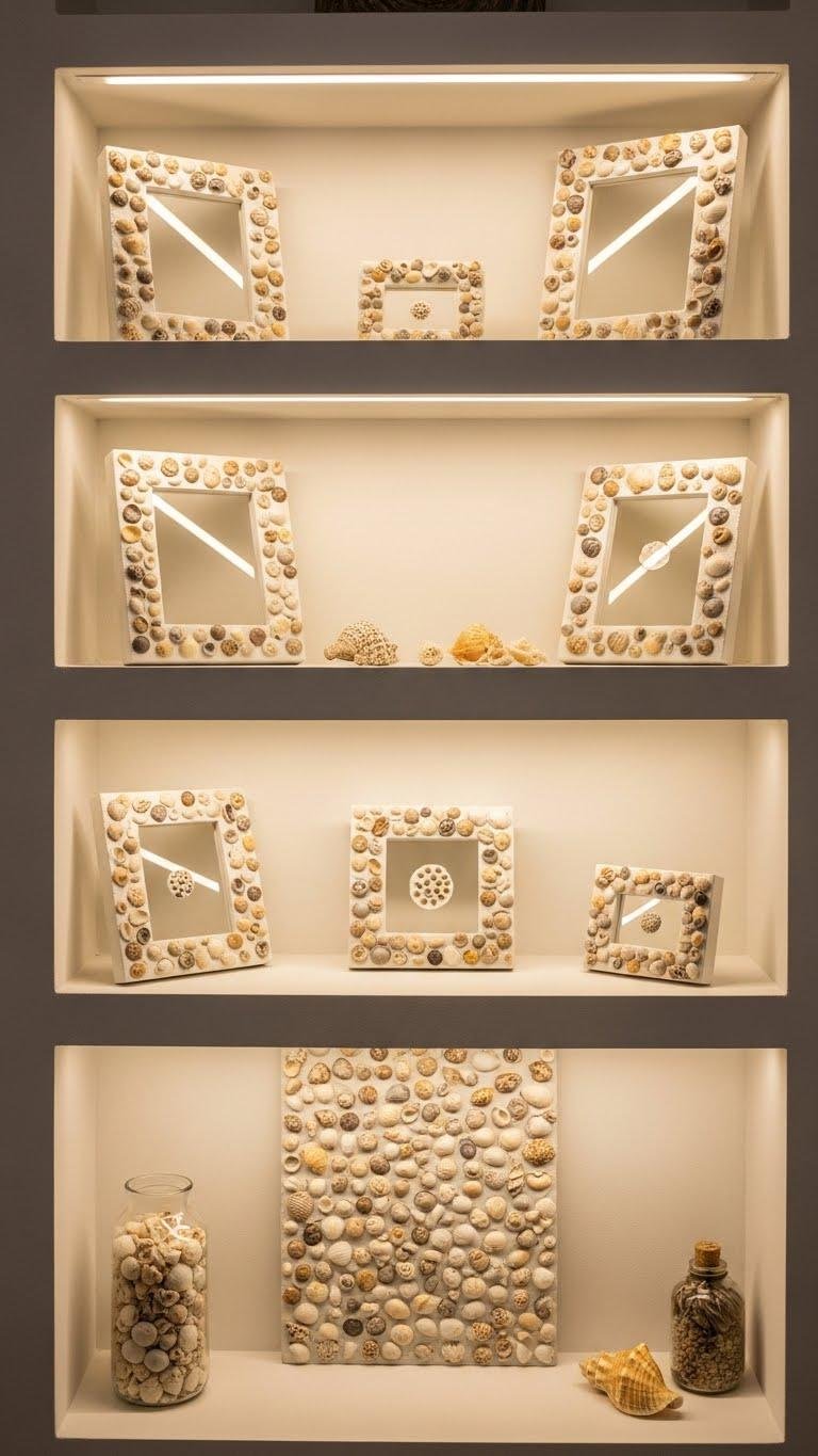 After brightening shelves with LED strips, you can soften that modern edge by introducing Seashell-Embedded Spackle Decor for a coastal, textured contrast.