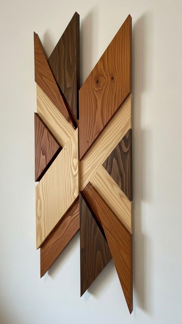 If your reclaimed shelves bring warmth and structure, geometric wood wall art adds crisp rhythm and visual contrast to that same wallplane.
