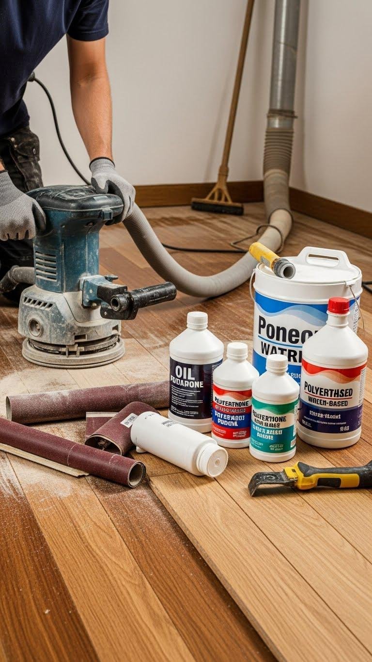 You’ll choose proper sanding techniques to remove old finish and level boards, then decide on finish selection—oil, polyurethane, or water-based—matching durability and sheen.