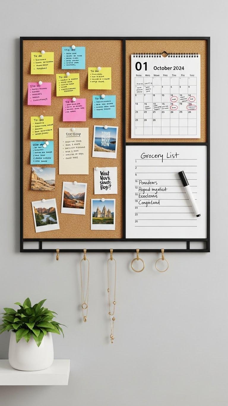 When you want a chic, functional command center, a framed corkboard organizer gives you clean lines and quick access to notes, photos, and to-dos.