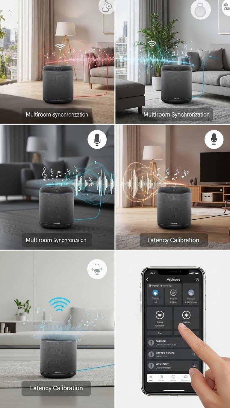 You’ll create whole-home audio scenes by grouping devices, enabling multiroom synchronization, and assigning default zones. Use latency calibration tools in the app to fix echo and timing drift.
