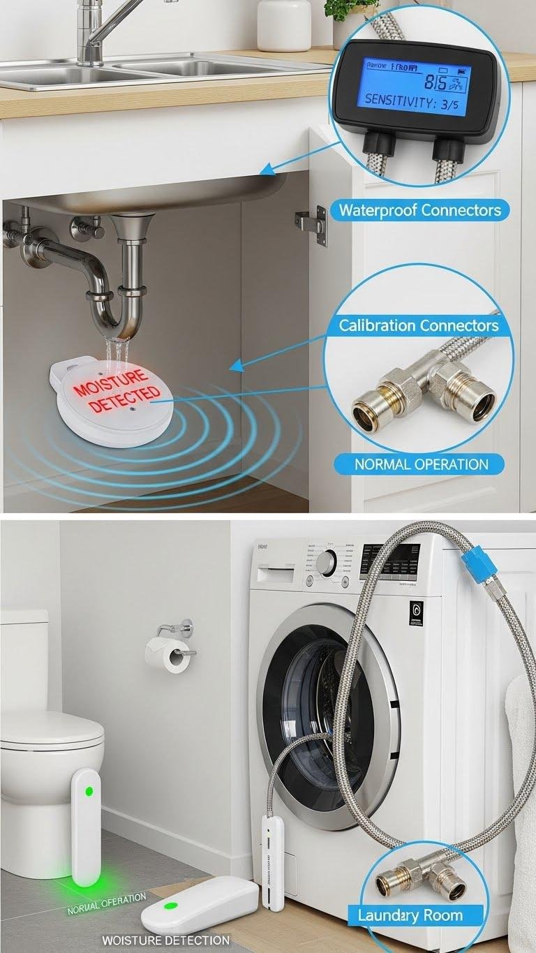 You’ll set sensor calibration for sensitivity, place units at risk points, and use waterproof connectors for durability.
