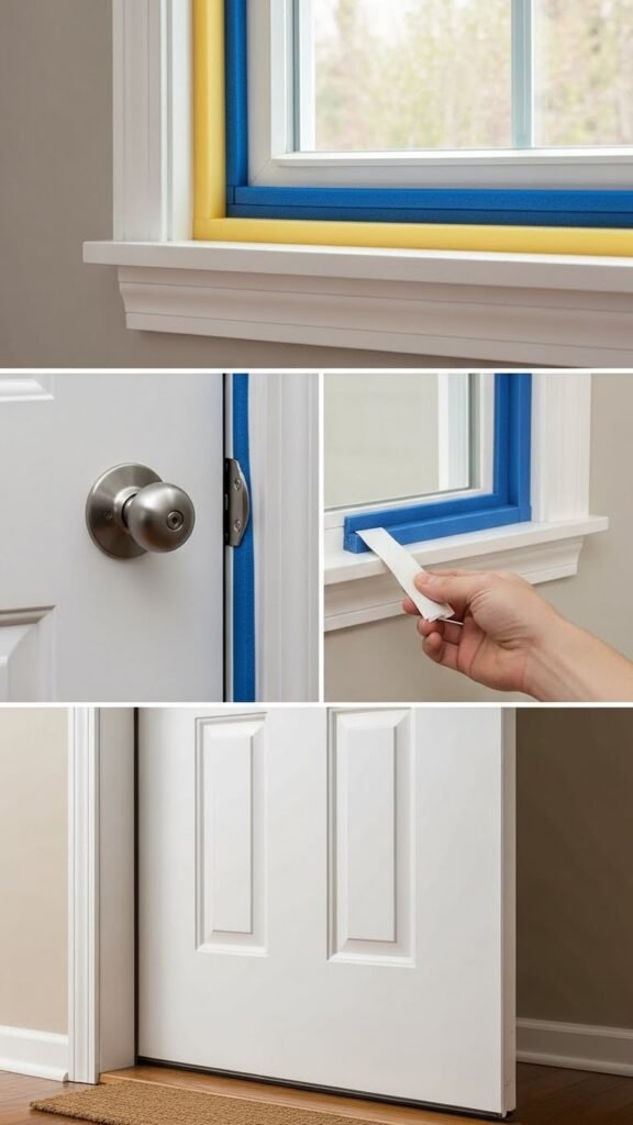You’ll run foam or V-strip along frames, apply adhesive draft sealant to tight gaps, and fit a threshold sweep under exterior doors.