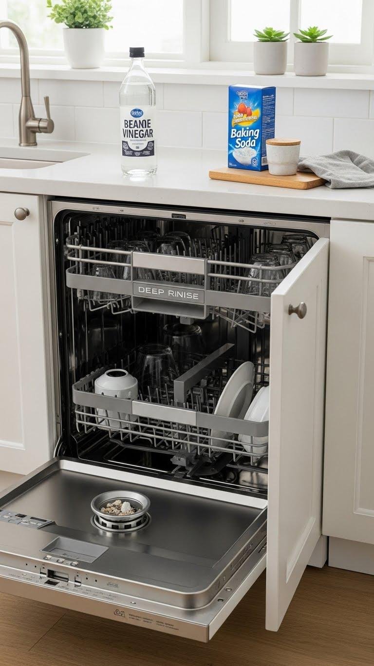 Run a deep rinse cycle with vinegar and baking soda, scrub seals and spray arms, then clear the disposal trap.