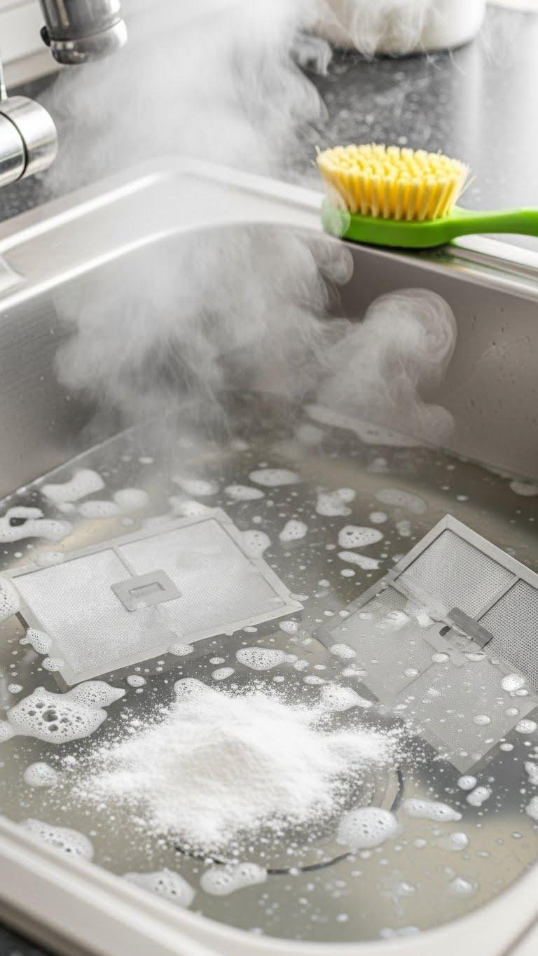 Grease builds up fast on vent hood filters, but you can cut through it quickly with the right technique. Fill a sink with hot water, add baking soda and a few drops of dish soap, then soak filters 15–20 minutes.