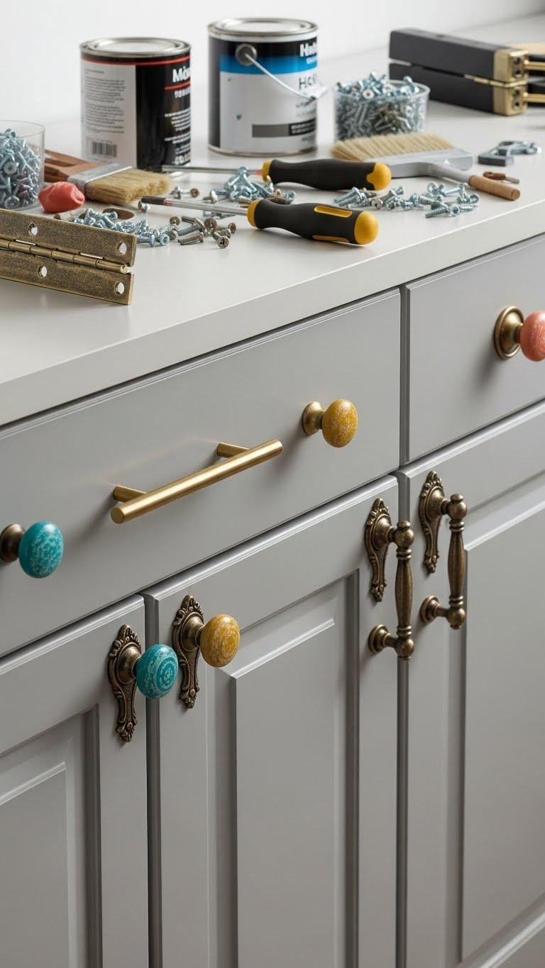 You can paint knobs for a pop of color, refinish hinges for a cohesive finish, and mix vintage pulls with modern ones.