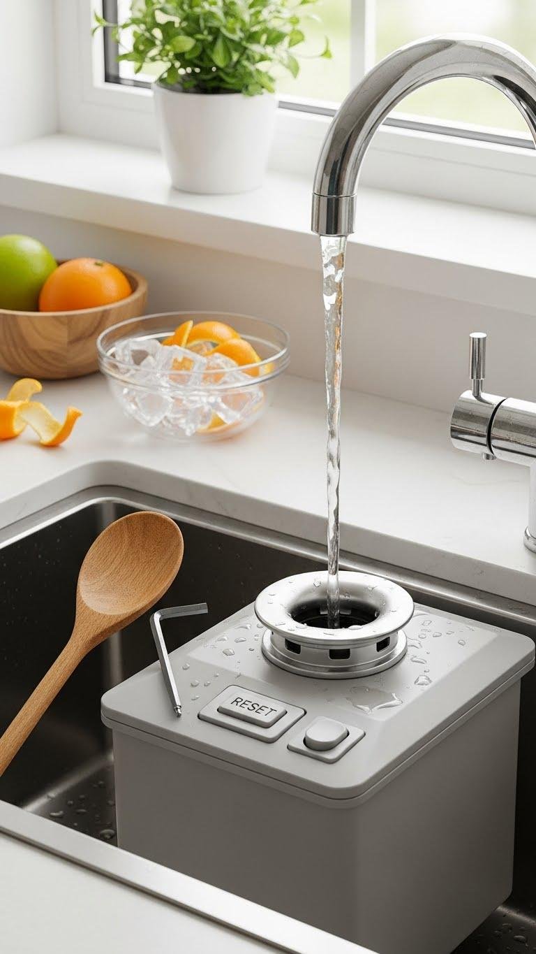 Give your sink a quick reset before you call for help: turn off the power, clear visible debris, and use an Allen key or a wooden spoon to manually spin the disposal’s flywheel from under the unit to free a jam.