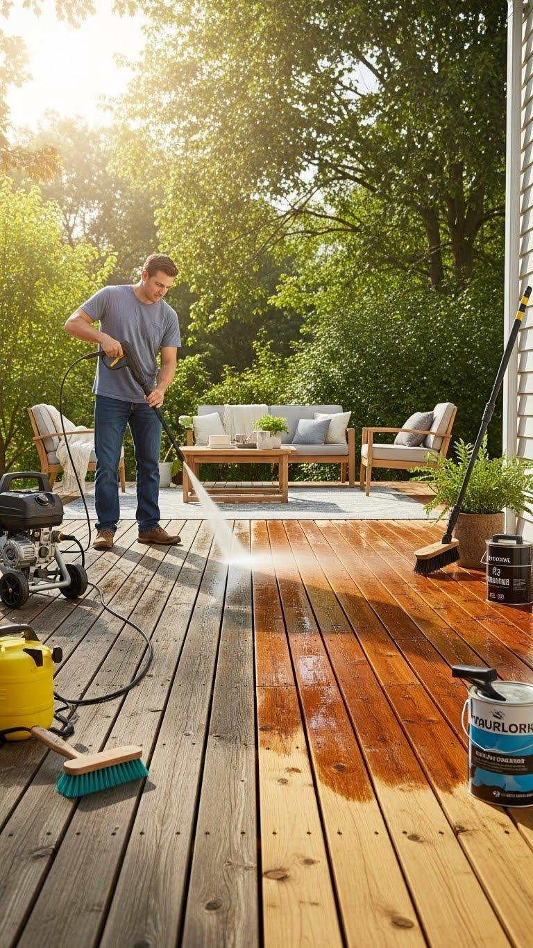 After sprucing up your cabinets, shift the same DIY energy outdoors and tackle the deck—powerwashing and staining will bring weathered boards back to life and make your outdoor space feel like an extension of the kitchen.