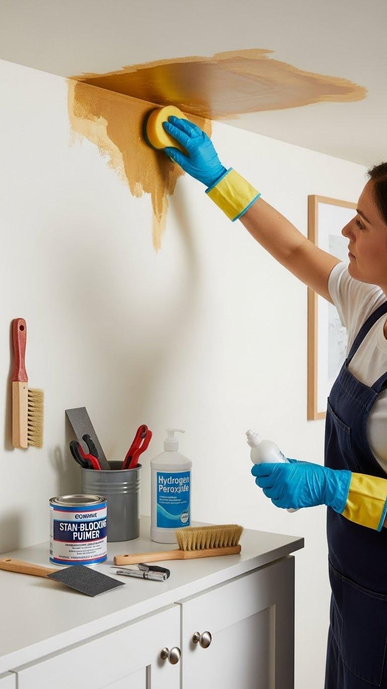 Confirm the leak’s fixed, blot dry, then apply hydrogen peroxide to kill stains. Sand lightly, clean, and use a stain-blocking ceiling primer before repainting. You’ll regain calm, control, and a clean ceiling.