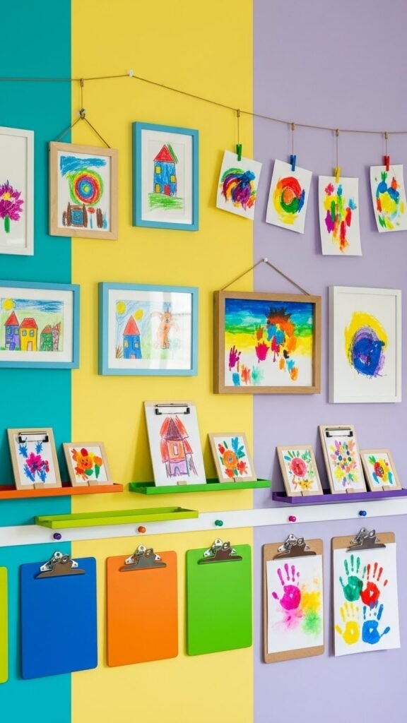 Set up a gallery wall to show off your kid’s latest masterpieces and swap them out in seconds — think simple frames, clipboards, or a hanging wire with clips so you can change artwork as often as they bring it home.