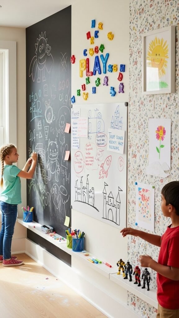 You’ll pair magnetic paint for toy magnets and notes, or choose erasable wallpaper for easy swaps.