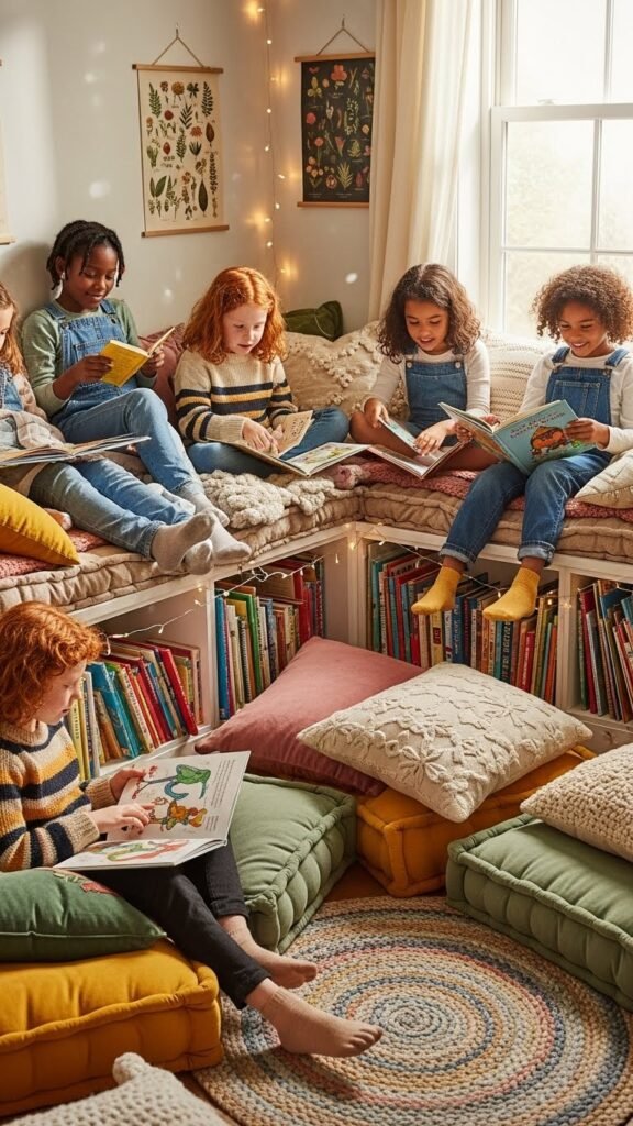 After a day of chalky masterpieces and marker-fueled storytelling, give kids a snug corner where those adventures can continue on the page—enter a reading nook with cozy cushions.