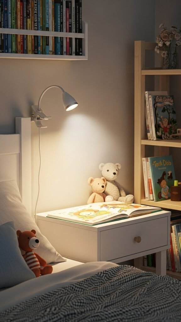 You’ll love how clip-on lights turn a bedside into a cozy reading nook without cluttering limited space: they clamp neatly to headboards, shelves, or nightstands and direct soft, focused light exactly where kids need it.