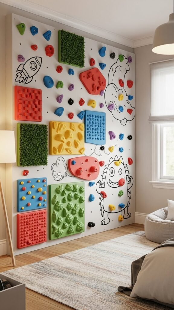 A climbing-play wall turns a plain bedroom surface into a hands-on adventure zone that builds strength, coordination, and imagination while saving floor space.