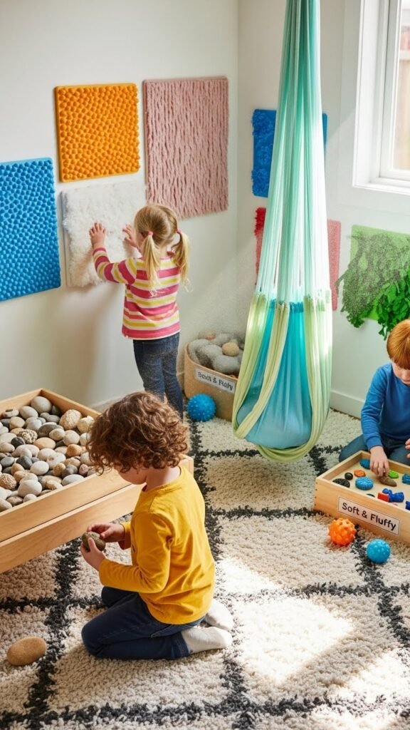 Turn discovery into a texture scavenger game, label touch stations, and let kids rearrange items for playful, self-directed calm and creativity.
