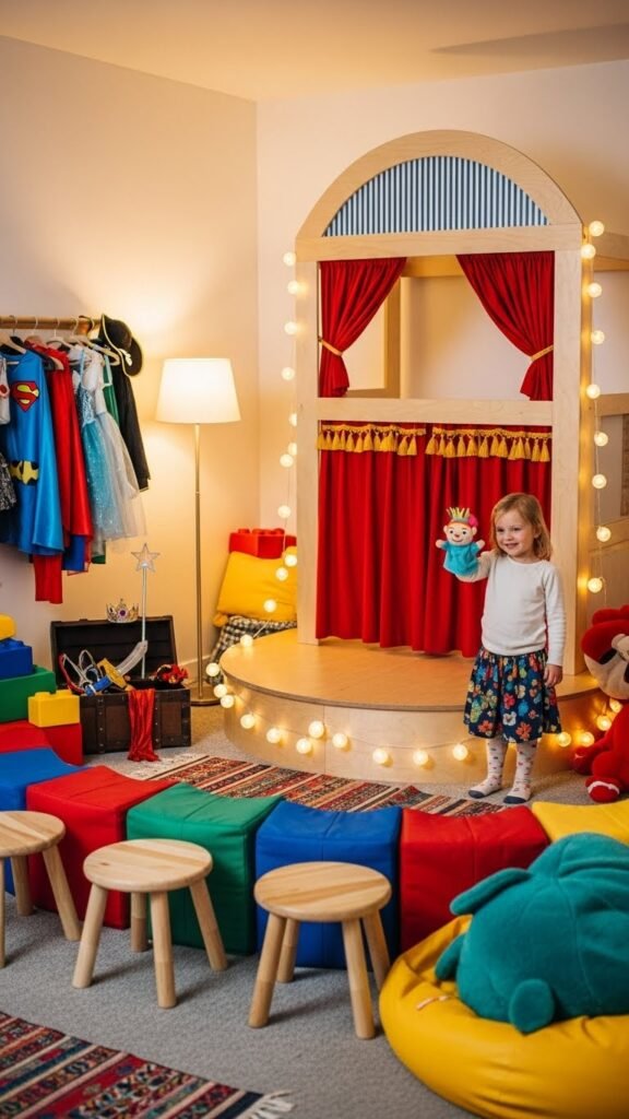 Create a tiny performance nook where your child can sing, act, and shine — a low platform, a curtain, and a few props turn a corner of the room into a mini stage that sparks confidence and creative play.