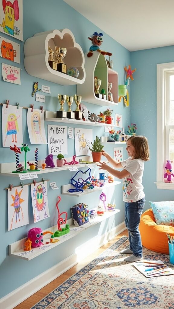 Display-shelves tailored to your kid’s height turn a wall into a rotating gallery where drawings, trophies, and quirky crafts get the spotlight they deserve.