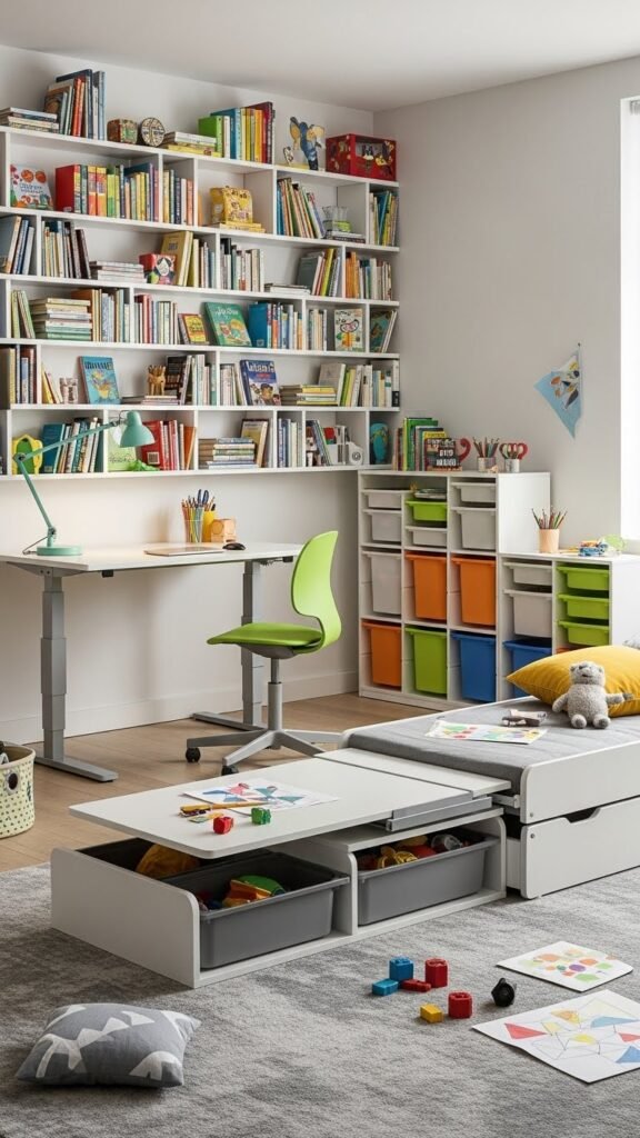 Pairing a playful library wall with furniture that adapts as kids grow keeps the room useful year after year. You’ll love modular pieces with adjustable heights and convertible storage — desks that shift, beds that extend, bins that reconfigure. They free your child to explore, let you rearrange for new passions, and save space without sacrificing style. It’s smart, playful freedom that lasts.
