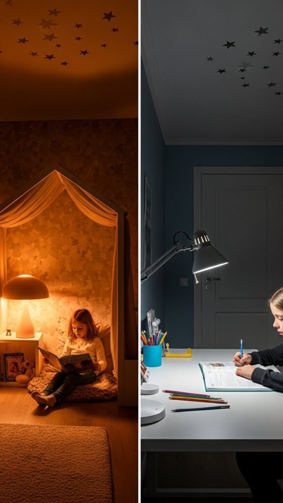 Often you’ll want lighting that shifts with the night: soft for bedtime, brighter for storytime or late homework.